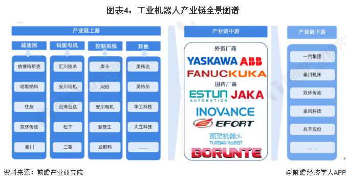 從產業鏈各環節代表企業來看,上游核心零組件代表企業有安川電機、匯川技術、雙環傳動等核心零部件供應商 ; 產業鏈中游代表企業有安川、ABB 等外資品牌。以及埃斯頓、埃夫特等國產品牌 ; 從產業鏈下游來看,應用主體包括汽車制造、船舶制造、裝備制造等工業企業。