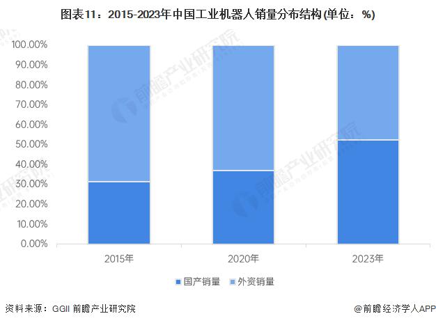 從工業機器人行業內資廠商和外資廠商銷量情況來看,2015 年,內資廠商的銷量占比僅有三成左右,到 2023 年,內資廠商銷量占比超過一半,首次超過外資廠商銷量。