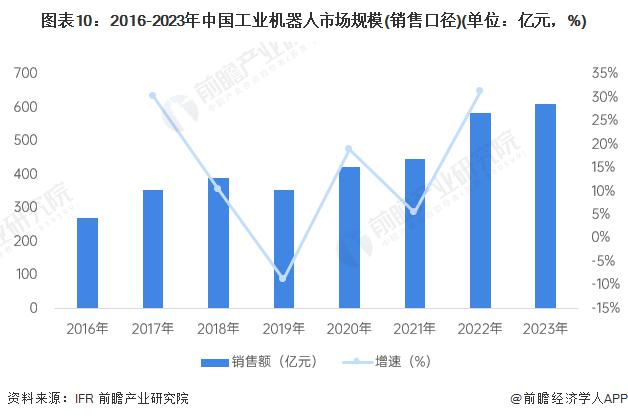 我國工業機器人市場發展較快,約占全球市場份額三分之一,是全球第一大工業機器人應用市場。當前,我國生產制造智能化改造升級的需求日益凸顯,工業機器人的市場需求依然旺盛,據 IFR 統計,2022 年我國工業機器人市場規模超過 500 億元,全球占比 45%,穩坐全球工業機器人第一大市場地位?;诠I機器人銷量增速,初步測算 2023 年中國工業機器人市場規模達到 610 億元。