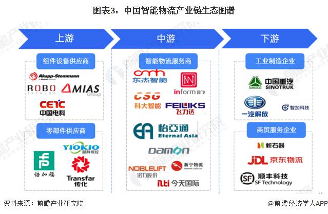 智能物流行業產業鏈主要分為上、中、下游三個部分。上游主要為單機設備和零部件提供商 ; 中游是解決方案提供商,自身擁有核心設備或軟件產品,并根據行業的應用特點使用多種設備和軟件,設計建造物流自動化系統 ; 下游是應用物流自動化系統的各個行業,主要分為工業生產和商業配送。