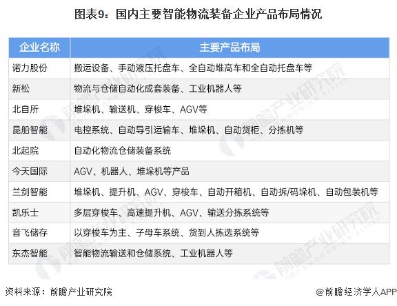近年來,智能物流裝備在新形勢下需求猛增,市場客戶群體、應用領域快速增長。智能物流裝備廠商在激增的多樣化需求刺激下也從橫向、縱向提高了產品供給。我國智能物流裝備行業參與主體包括技術型企業、傳統物流企業、傳統工業裝備制造企業等。部分企業的產品布局如下: