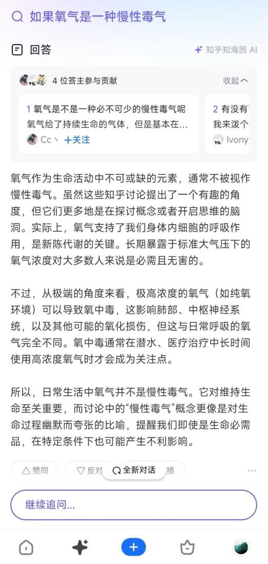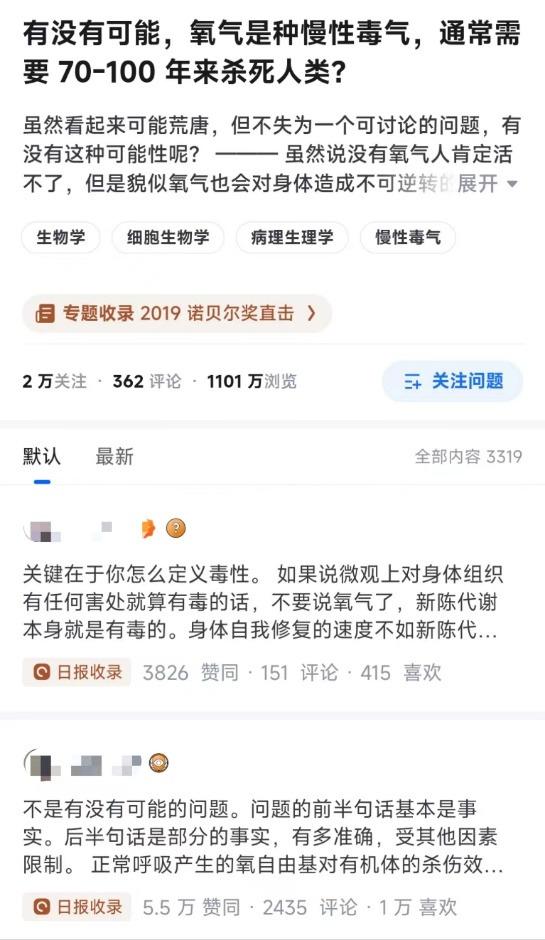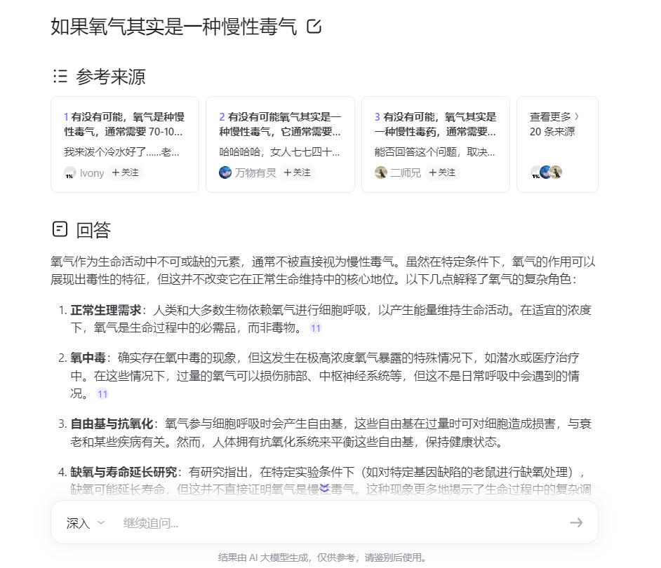 甚至從原話題下看到的一些悖論思考,包括 " 正常呼吸產(chǎn)生的氧自由基對(duì)有機(jī)體的殺傷效應(yīng)是確鑿事實(shí) "、" 當(dāng)限制熱量能提升小鼠壽命,那食物是不是慢性毒品 " 等等五花八門的論題,在 AI 答案下似乎與其毫無關(guān)系。