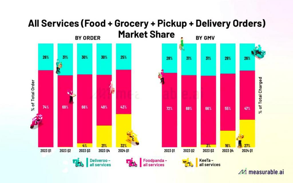 一個月前,市場調(diào)研公司 Measurable AI 發(fā)布數(shù)據(jù),美團在香港公司 KeeTa 以 43% 的送單量份額名列榜首;按 GMV 計算美團也成功超越 Deliveroo。這一切距離美團正式入駐香港,也僅僅過去了一年。