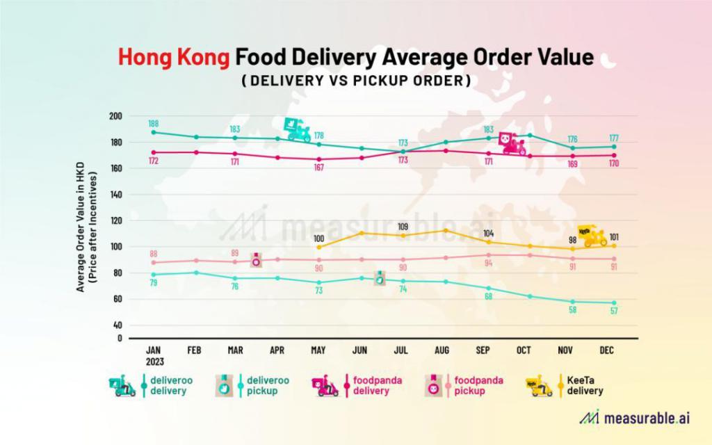 2023 年 5 月 22 日,美團旗下外賣品牌 KeeTa 正式登陸香港。與內(nèi)地外賣服務不同,香港騎手人力成本遠高于內(nèi)陸,甚至配送費比餐費還貴的情況屢見不鮮。由于外賣費用過于高昂,美團入住前香港本地兩家主流的外賣平臺 Foodpanda 和 Deliveroo 送餐上門的平均客單價均不少于 170 港幣。外賣小哥極高的成本甚至催生了到店取餐的繁榮。
