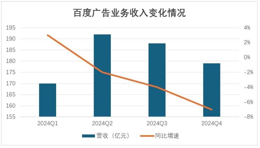 而將 730 億在線營銷收入拆分到具體的季度指標來看,下滑趨勢呈現得更為直觀。Q3 的同比降幅為 3%,Q4 降幅直接加速至 7%。這標志著,百度廣告收入已經進入衰退周期,連續三個季度同比下滑,且降幅逐季擴大。