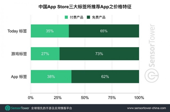 同樣,免費(fèi)產(chǎn)品相較付費(fèi)游戲更容易獲得推薦,如Today中,被推薦的產(chǎn)品中有65%是免費(fèi)游戲;游戲標(biāo)簽中,被推薦的產(chǎn)品中73%是免費(fèi)游戲;App標(biāo)簽中,被推薦的產(chǎn)品中62%是免費(fèi)游戲。可以看到,免費(fèi)游戲相比付費(fèi)產(chǎn)品具有壓倒性的優(yōu)勢。