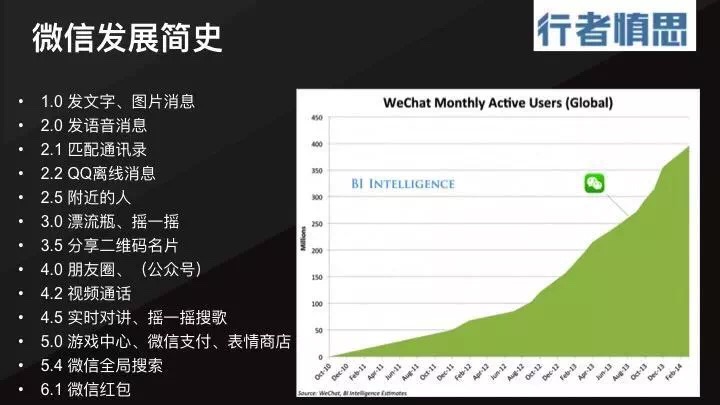 下圖右邊是微信在全盛時期 14 年 2 月之前的活躍用戶增長情況。左邊,是從微信 1.0 到 6.1 的每個版本的發展次序。