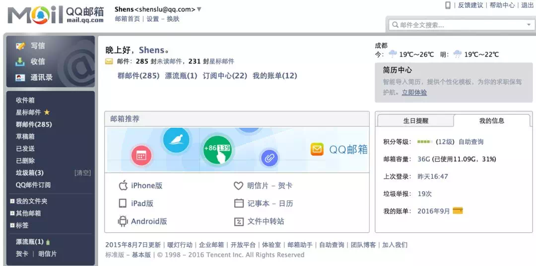 我給大家復習一下,看看 QQ 郵箱長什么樣子(2016 年 9 月截圖):