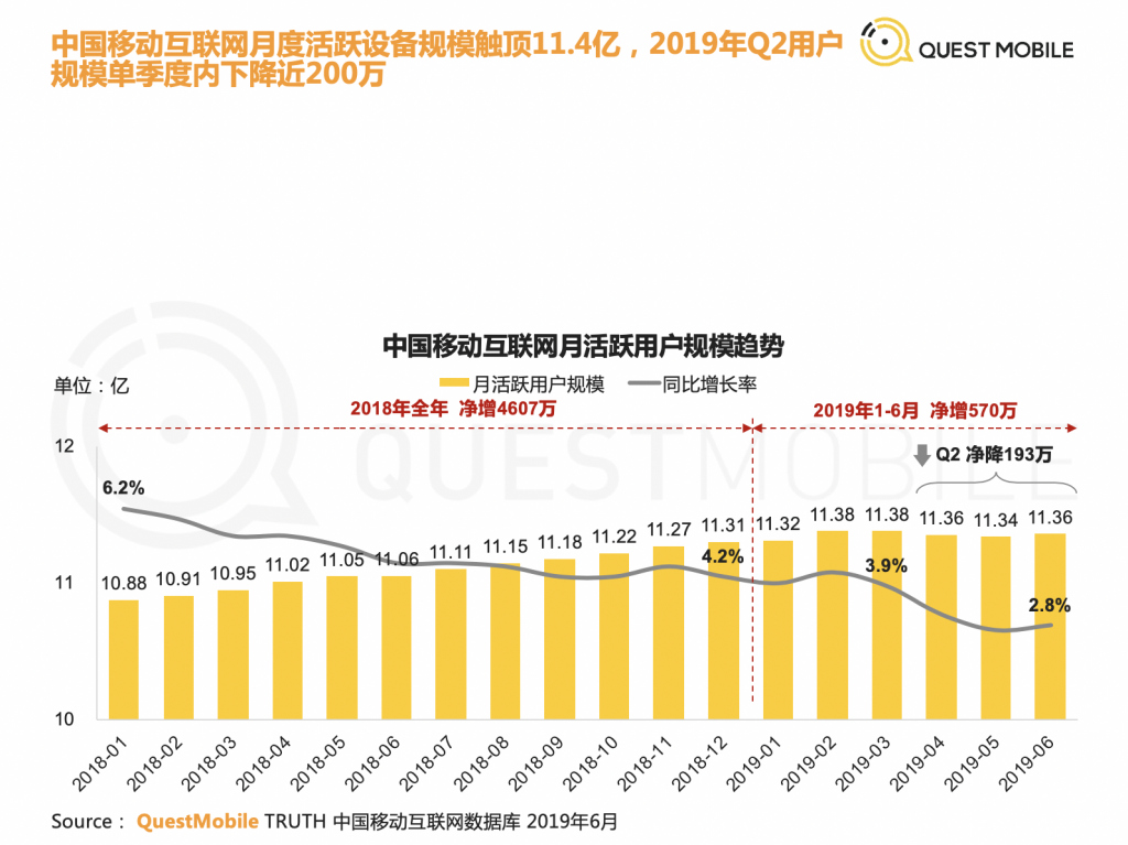報告顯示,從 2018 年 1 月到 2019 年 6 月,中國移動互聯網用戶月活躍用戶(MAU)規模的同比增長率從 6.2% 逐步跌到 2.8%,從今年 2 月開始,MAU 規模不再繼續增長,甚至在 2019 年 Q2 凈降 193 萬。也就是說,中國移動互聯網月度活躍設備規模觸頂 11.4 億。同時,用戶平均每天花在移動互聯網的時間近 6 小時,但時長增速也有所放緩。