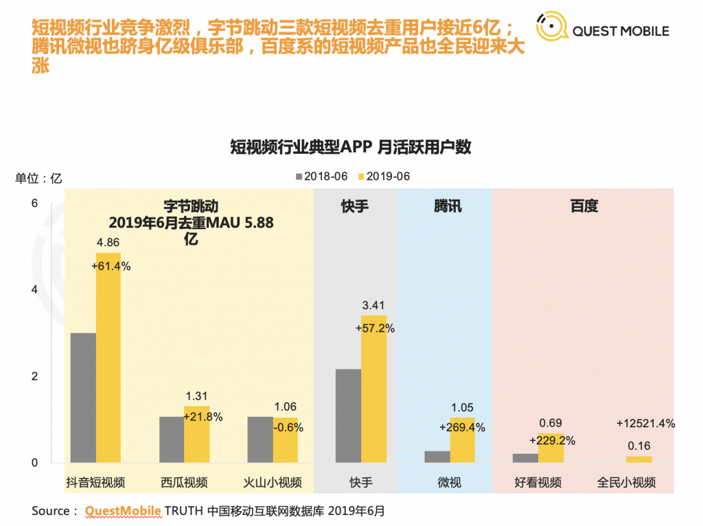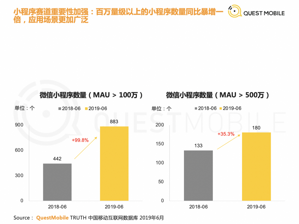 具體來看,娛樂化內容消費依然是時長增量主要來源,尤其短視頻行業,貢獻了 60% 以上的整體時長增量。而小程序在時長增長上也表現了極大的潛力。微信小程序里,MAU 超過 500 萬的小程序數量由 2018 年 6 月的 133 個,增至 2019 年 6 月的 180 個,MAU 超過 100 萬的,則已經達到 883 個。