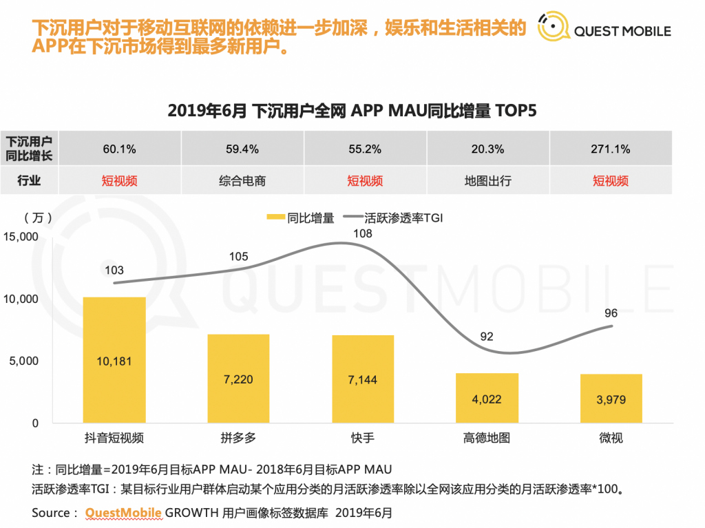 QuestMobile 的報告指出,下沉市場成為 2019 年最重要的戰場,泛娛樂行業在下沉市場中優先獲得紅利,其中以短視頻最為突出,同比增量過億。娛樂和生活相關的 app 在下沉市場得到最多新用戶。就免費閱讀在下沉市場的表現為例,數字閱讀行業迎來新的紅利期,在免費閱讀的模式加持下,向下沉市場進擊,行業用戶規模同比大增 1 億至 4.84 億。至 2019 年 6 月,主打免費模式的 app 數量繼續擴大,占比已超 60%。