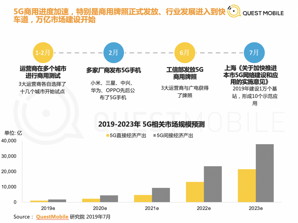 和以往的報告相比,QuestMobile 這次強調了一個新的關鍵詞—— 5G。2019 年 6 月 6 日,工信部正式發布了 5G 商用牌照,中國正式進入 5G 商用元年。報告指出,隨著 5G 基礎建設進程加快,萬億市場即將爆發。據預測,5G 所帶來的直接 / 間接經濟產出將在未來幾年逐步突破萬億水平。5G 將促進物聯網應用爆發,預計智能家居、智能汽車等行業將最先受益,數萬億的智能設備市場將被激活。