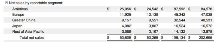 大中華區當季的營收為 91.6 億美元, 較去年同期的 95.51 億美元下滑 4%,這是大中華區銷售額連續第三個季度同比下滑,但此前兩個季度大中華區的收入下滑高達 21% 和 25%。