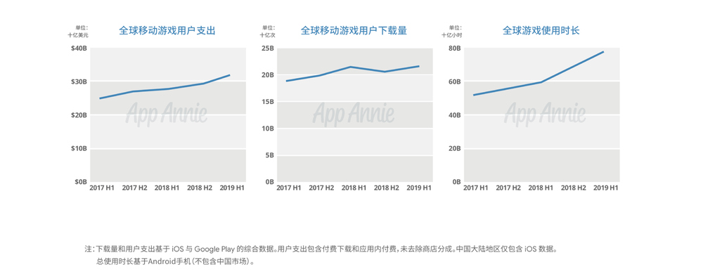回到報告來看,當 " 下載量開始放緩、用戶使用市場增長迅猛、用戶支出逐漸增加 " 時,預示著全球的移動游戲經濟開始進入下半場,在這樣中后期的階段," 時長 " 將會帶動 " 支出 " 繼續增長,直到相繼觸碰到市場天花板。