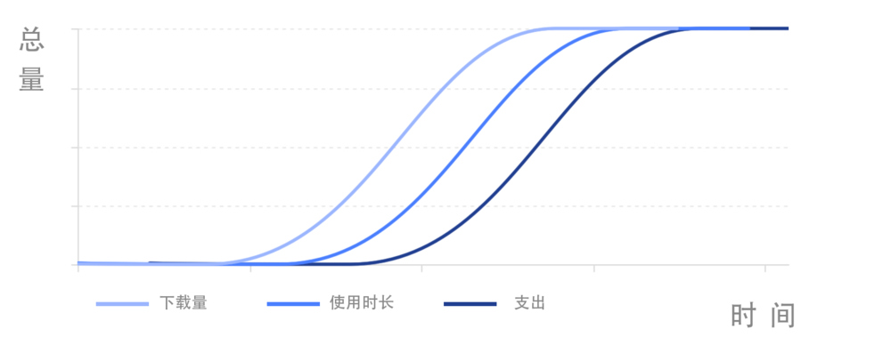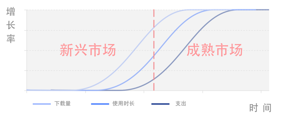 先來看一個業內常見的市場成熟度模型:對于一個新興市場來說,下載量必然是首先起飛的,隨著應用裝機量的提升,帶動使用時長的增長,最后帶動收入;而最先開始增長的下載量也必然先接觸到天花板。