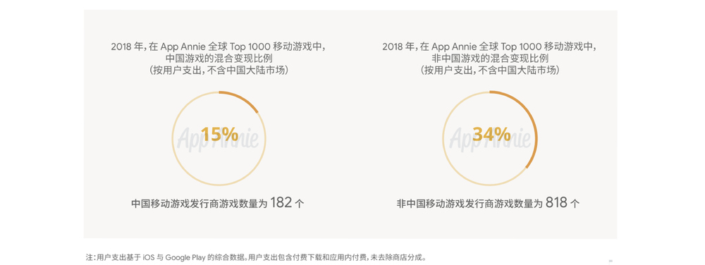 根據報告數據,在全球移動游戲支出的 top1000 中,超過三分之一的海外廠商選擇了混合變現的方式;同樣的數字落到中國游戲只有 15%。