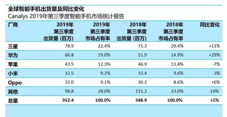 第二名華為出貨了 1160 萬部,市場份額為 22.2%,比去年同期的 1170 萬部基本上持平;