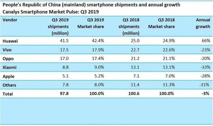 從中國國內(nèi)的情況來看,華為(含榮耀品牌)智能手機的出貨量達到了 4150 萬部,同比增加了 66%,市場份額占比高達 42.4% ——這是華為連續(xù)六個季度在中國智能手機市場的同比增長率達到兩位數(shù)的百分比,而這一次的 66% 是一個令人震驚的增長比。同時,在華為一枝獨秀的增長態(tài)勢之下,其他幾家排名靠前的廠商都出現(xiàn)了兩位數(shù)百分比且不低于 20% 的份額下降。