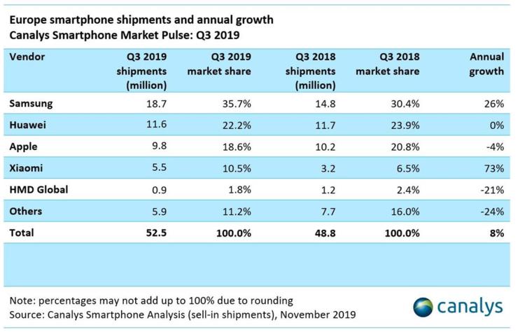 近日,知名市場調(diào)研機構(gòu) Canalys 發(fā)布了截止 9 月 30 日的歐洲智能手機市場 2019 Q3 的出貨量報告。報告顯示,歐洲市場在 2019 年 Q3 一共賣出了 5250 萬臺智能手機,比去年同比增長了 8%,從而使得它成為全球范圍內(nèi)同比增長幅度最大的區(qū)域,比亞太地區(qū)的 6% 還高了兩個百分比。