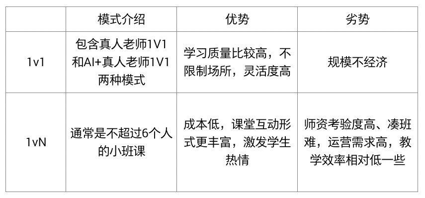 目前市場上的培訓課基本上有 1V1 或者一對多的小班課兩種模式。1V1 教學效率高,其教學時間靈活,內容個性化定制,小班課課堂互動形式更加豐富,更容易調動學生學習積極性。