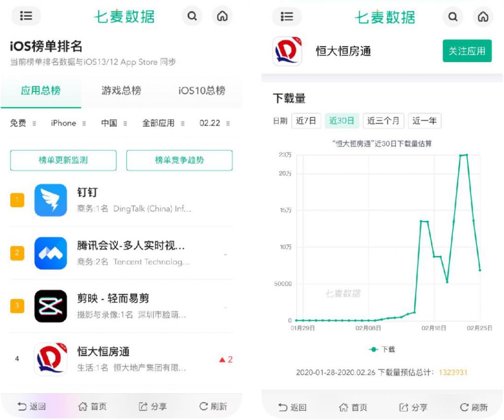 2 月 16 日,恒大發(fā)布全國各樓盤特大優(yōu)惠通知,表示在 2 月 18 日至 2 月 29 日期間,恒大全國各在售樓盤(含公寓及寫字樓),可享受 7.5 折優(yōu)惠。用戶可在其線上產(chǎn)品「恒大恒房通」中,實景查看樓盤信息,了解戶型、居住條件、周邊設(shè)備等,一時之間引發(fā)網(wǎng)友熱議。「恒大恒房通」近期 App Store 榜單排名也因此直線上升,沖進應(yīng)用免費榜 Top4,iOS 單日預(yù)估最高下載量也達到了 23w。
