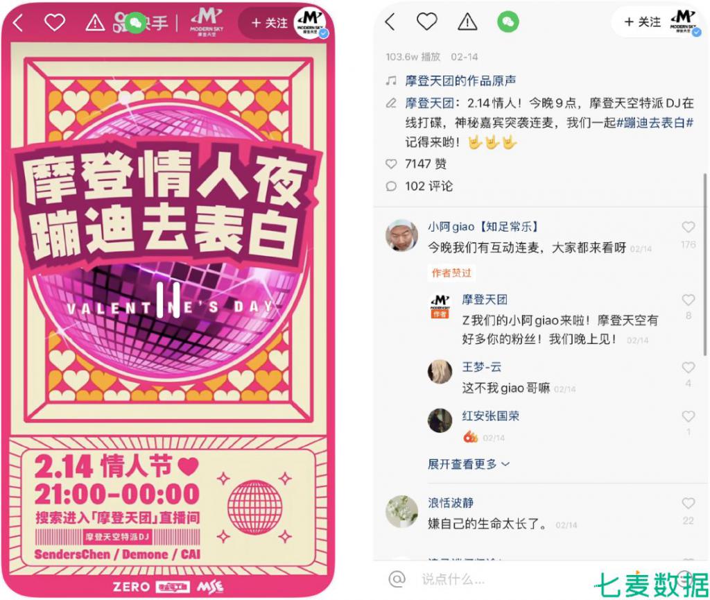 1 月底,「B 站」聯(lián)合對角巷等樂隊率先推出 " 線上音樂節(jié) " 活動,音樂與互聯(lián)網(wǎng)的結(jié)合方式,給了其他以年輕用戶為主的短視頻、直播平臺新的發(fā)展方向。「抖音」、「快手」開聯(lián)合線下夜店推出 " 云蹦迪 " 活動,用戶在家即可感受酒吧躁動的電音和迷幻的燈光。同時,還邀請明星、歌手、樂隊入駐加盟,讓他們與用戶直播唱歌、互動,借助粉絲經(jīng)濟拉動日活。活動效果十分顯著,摩登天團在入駐「快手」后,在情人節(jié)發(fā)布的蹦迪活動視頻,便獲得 103.6w 播放量。