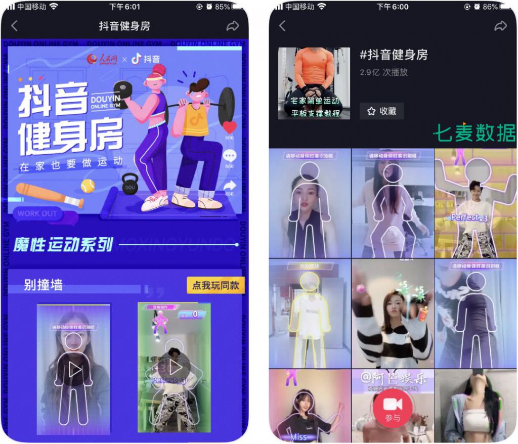 同時,「抖音」也開啟為期兩周的 " 線上健身房 " 活動,邀請汪東城、蔣夢婕、陳一冰等健身達人和明星,號召用戶在家做運動。與其他開展 " 線上健身房 " 平臺不同的是,「抖音」專門為健身推出了相關(guān)的小游戲 " 別撞墻 "、" 殺毒達人 "。如用戶需在規(guī)定時間內(nèi),完成 " 墻上 " 的深蹲、聳肩、拉伸等動作,否則將會撞到前方的 " 墻 "。這既發(fā)揮了抖音超休閑小游戲的特性,也讓健身增加趣味性,一時之間吸引了大量用戶的參與。" 抖音健身房 " 相關(guān)話題視頻,得到 2.9 億次播放,其中不少視頻都與健身小游戲相關(guān)。