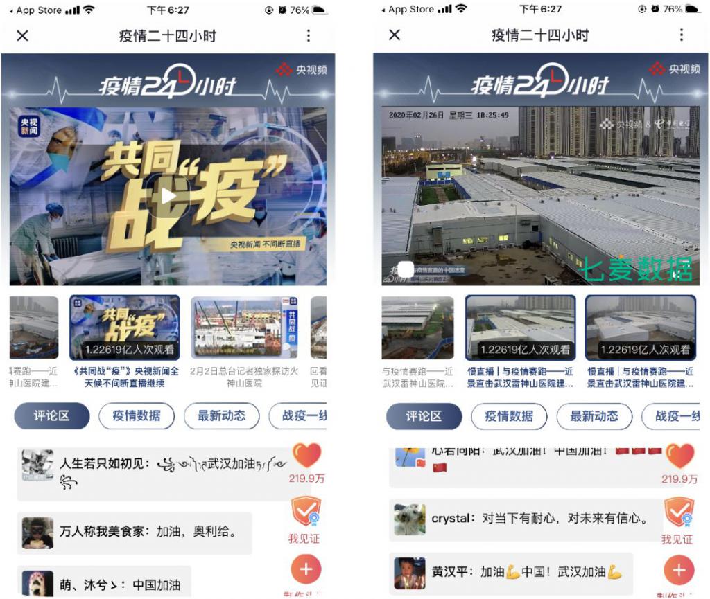 「央視頻」為疫情專門展開的 24 小時慢直播,成功拓展了直播行業(yè)的新途徑。此次的 " 疫情 24 小時 " 直播包括直播火神山、雷神山兩所醫(yī)院的建造,一線醫(yī)院工作情況等等,全都是國人最為關(guān)注的事件。因此十天左右便獲得了累計 1 億人的觀看。