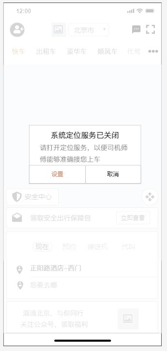 頁面入口:滴滴出行app啟動后,在判斷2.2.1中權限后,檢測到設備GPS未打開時,即可彈出該頁面;