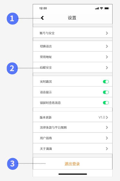 提供賬號與全、切換語言、常用地址、行程安全、實時路況、語音提示、鎖屏時查看消息、版本更新、法律條款與平臺規則、用戶指南、關于滴滴設置。