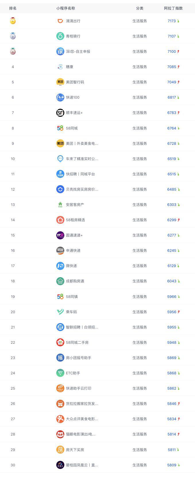 在本周生活服務周榜 TOP30 中,出行類小程序「美團智行碼」、「青桔騎行」和「乘車碼」分別位列生活服務周榜前三。