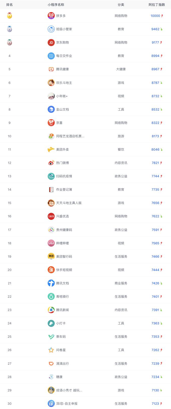 在阿拉丁指數(Aldzs.com)發布的 2020 年 3 月 23 日 ~2020 年 3 月 29 日阿拉丁小程序指數周榜 TOP30 中,「拼多多」、「班級小管家」和「京東購物」位列榜單前三,教育類小程序「作業登記簿」、工具類小程序「問卷星」沖入周榜 TOP30。