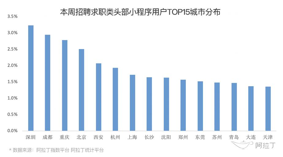 隨著疫情防控逐漸明朗,企業實際復工比例的逐步提高以及大量人才返回工作所在地,就業市場開始回溫,根據阿拉丁招聘求職類小程序 DAU 增長數據可看出,本周頭部該類小程序較上月同比有明顯的增長,增長率達到 36.5%。