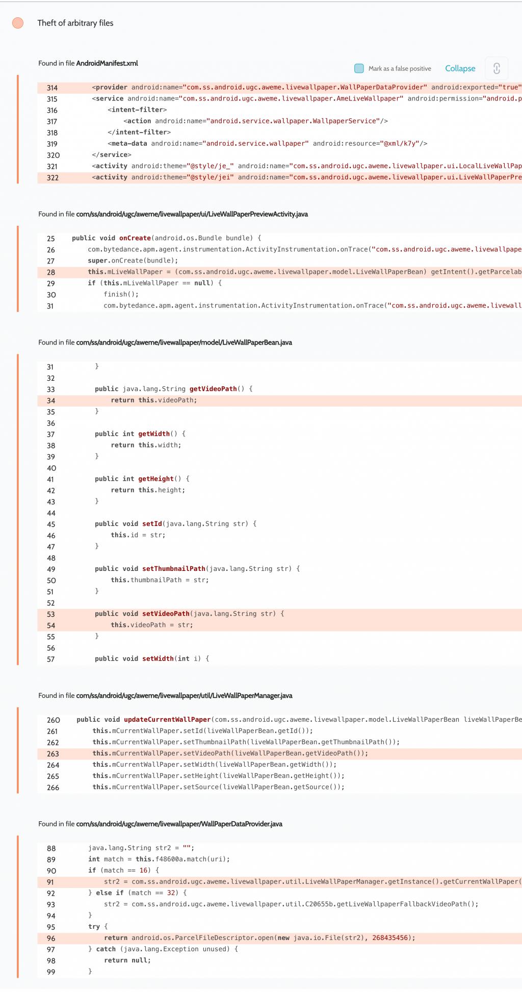 活動 com.ss.android.ugc.aweme.livewallpaper.ui.LiveWallPaperPreviewActivity 會被導(dǎo)出,然后從 live_wall_paper 密鑰中獲取一個 com.ss.android.ugc.aweme.livewallpaper.model.LiveWallPaperBean 類對象,然后寫入靜態(tài)域。然后,app 會從該靜態(tài)域中接收 getVideoPath ( ) ,在 provider com.ss.android.ugc.aweme.livewallpaper.WallPaperDataProvider 中創(chuàng)建一個 ParcelFileDescriptor,并返回給攻擊者:
