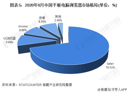 在平板電腦瀏覽器市場,由于 iPad 的熱銷,Safari 的市場份額成功超過了谷歌瀏覽器 ( 8.86% ) ,和 UC 瀏覽器 ( 9.64% ) 達到了 70.51%,近 3/4 的市場份額彰顯了其統治地位。