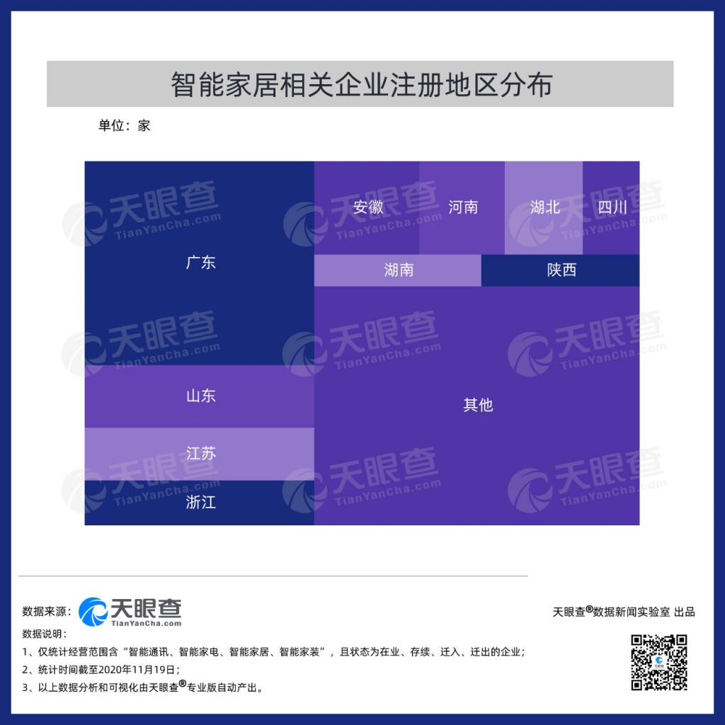從地域分布上看,我國智能家居相關(guān)企業(yè)主要分布在華東和華南地區(qū)。具體來看,廣東省以近 4.2 萬家的相關(guān)企業(yè)數(shù)量位居第一,占比 28.71%。山東省和江蘇省緊隨其后,均擁有超過 1 萬家相關(guān)企業(yè)。