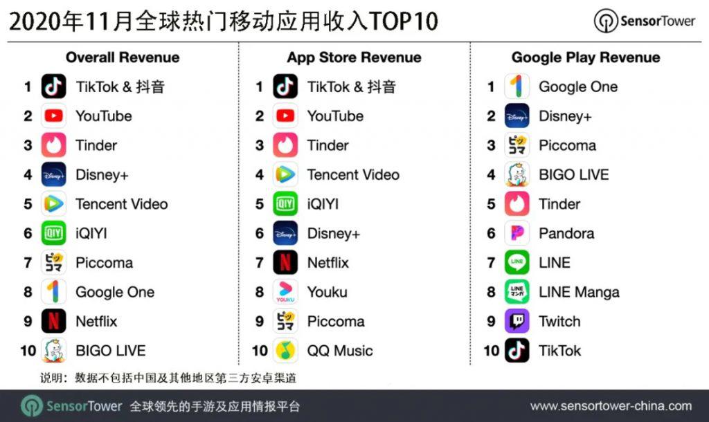 2020 年 11 月抖音及海外版 TikTok 在全球 App Store 和 Google Play 吸金超過 1.23 億美元,是去年 11 月的 3.7 倍,再次蟬聯全球移動應用(非游戲)收入榜冠軍。其中,大約 85% 的收入來自中國版本抖音;美國市場排名第二,貢獻了 8% 的收入;土耳其市場排名第三,占 2%。
