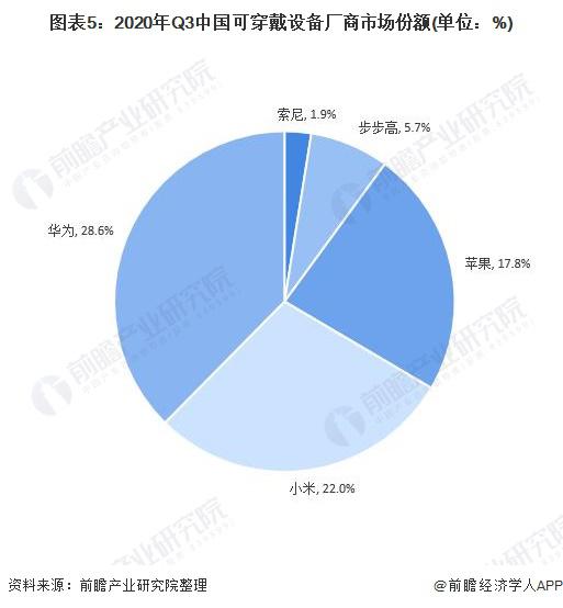 2020 年第三季度,中國可穿戴設備廠商市場中,華為市場份額占比達 28.6%,小米達 22%。蘋果占比 17.8%。華為力壓小米蘋果躍居第一。
