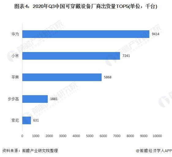 從可穿戴設備出貨量 TOP5 廠商排名來看,2020 年第三季度,華為以 941.4 萬臺出貨量穩居第一,市場份額 28.6%,出貨量同比增長 60.5%。