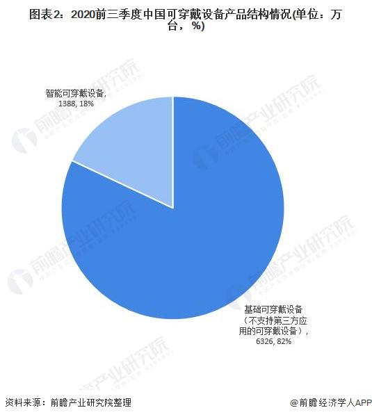 可穿戴設備可分為基礎可穿戴設備和智能可穿戴設備,基礎可穿戴設備仍然占據絕大部分比例。2020 年前三季度基礎可穿戴設備 ( 不支持第三方應用的可穿戴設備 ) 出貨量為 6326 萬臺,占比達到 82%,智能可穿戴設備出貨量為 1388 萬臺,占比達到 18%。