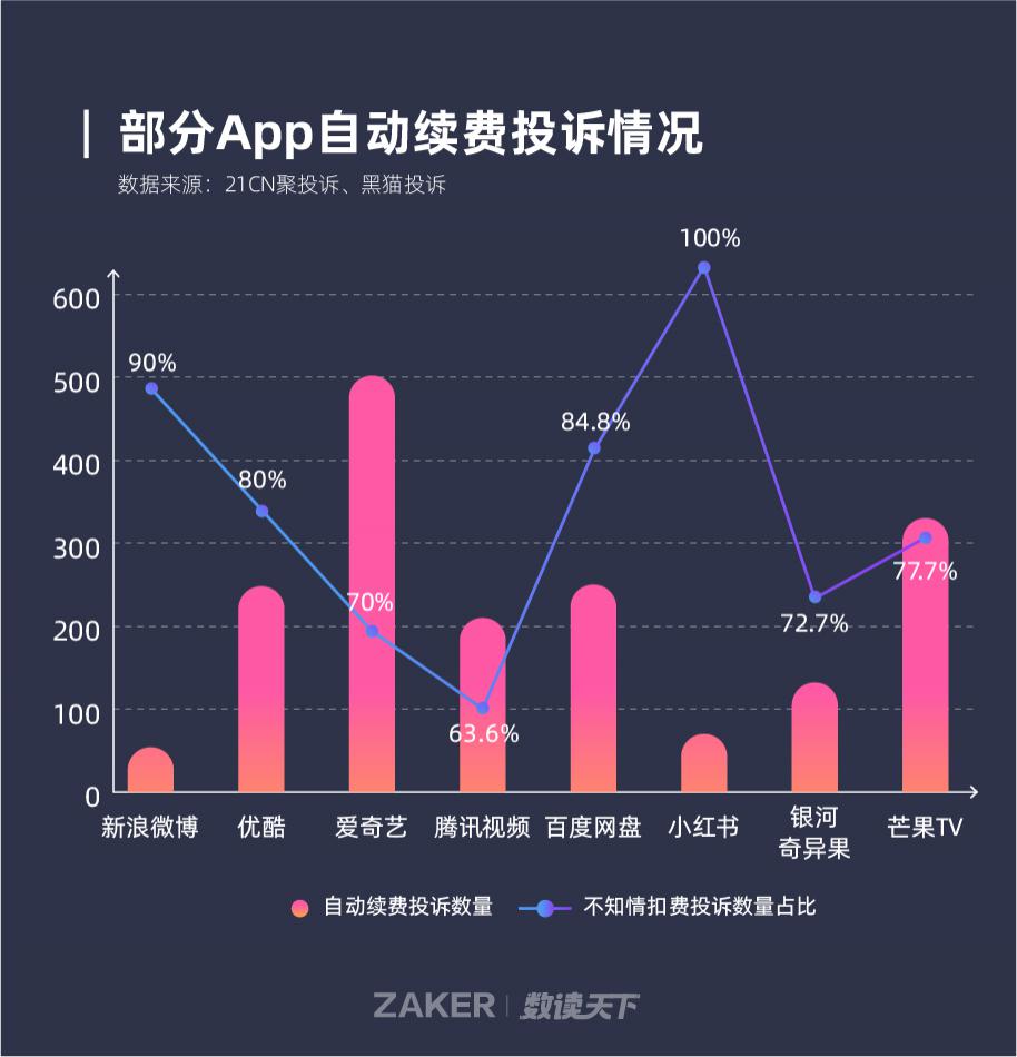 其中," 不知情自動續(xù)費扣款 " 占小紅書 " 自動續(xù)費 " 投訴的比重高達 100%,共有 250 名用戶投訴這一問題;新浪微博這個數(shù)字則高達 90%,優(yōu)酷和百度網(wǎng)盤該問題投訴的占比也達到了 80% 以上。