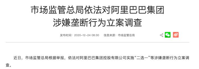 2 月 24 日早晨,新華社發布消息稱,近日,國家市場監管總局根據舉報,依法對阿里巴巴集團控股有限公司實施 " 二選一 " 等涉嫌壟斷行為立案調查。