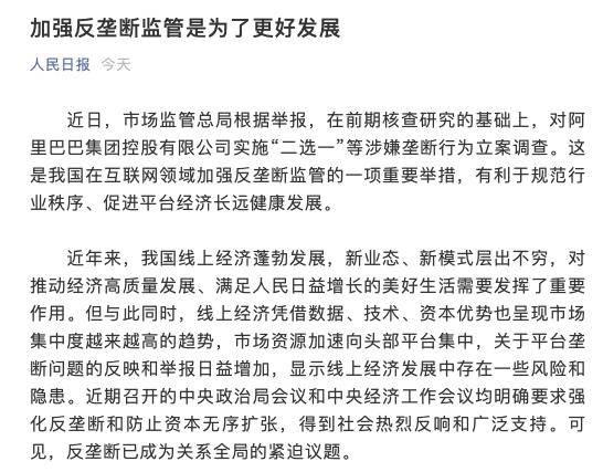 市場監管總局根據舉報,在前期核查研究的基礎上對阿里巴巴立案調查,這是我國在互聯網領域加強反壟斷監管的一項重要舉措,有利于規范行業秩序、促進平臺經濟長遠健康發展。